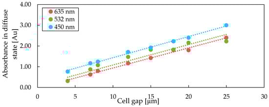 Change in absorbance with cell gap size of a diffuser in the scattering state for different wavelengths. The scattering for 532 nm signal is due to the quality of laser source.