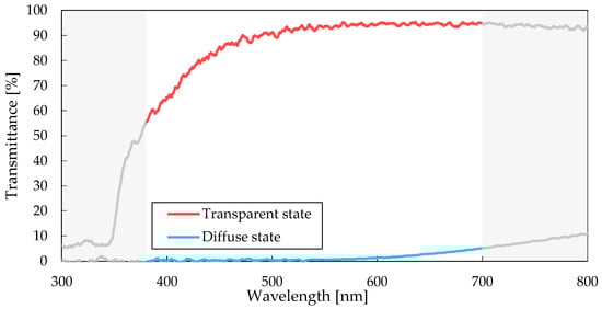 Spectral transmittance in diffuse and transparent diffuser-element states.