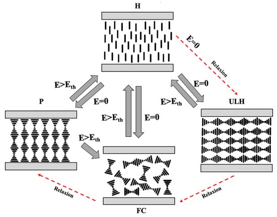 The transient increase in transmittance (M), seen as a peak (Figure 4) after the initial drop in transmittance, can be explained by the possible formation of an energetically favorable transient state, similar to the intermediate planar state observed for PDLCs [] or a microdomain orientation mechanism. A similar peak characteristic of the transient state can be seen in the FC-to-H transition but the distinctness of the peak depends on the driving conditions.