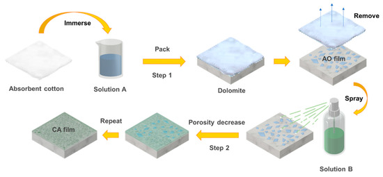 The facile two-step deposition resulted in a coherent and uncracked CaC2O4·H2O film. The cotton wool with Solution A was poulticed to the dolomite substrate surface and sealed, then stored at room temperature for 24 h, as shown in Figure 1 [35]. Following the reaction, Solution B was sprayed on the treated dolomite surface in concentrations of 0.02, 0.04, 0.06, 0.08 and 0.10 mol/L, and dried at room temperature (see Supplementary Materials Figure S3). After being sprayed four times, the film’s coverage area was increased. On the CA sample, a homogenous interconnected network of newly formed CaC2O4·H2O crystals was found.