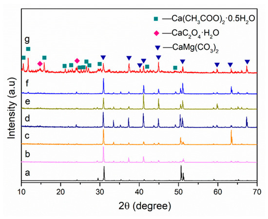 We studied the composition of these samples by X-ray diffraction (XRD) (Figure 2). A series of characteristic diffraction peaks (2θ = 30.92, 33.48, 50.45, 63.40) of dolomite were found in the XRD pattern of each sample. We can thus conclude that the two-step deposition process has a negligible effect on the intensity of dolomite reflection. Furthermore, most of the samples did not show the characteristic peaks of the CaC2O4·H2O phases, indicating that the newly formed phases in the treated dolomite had a low constituent. Ca(CH3COO)2·0.5H2O can also be found in the XRD patterns of the CA sample when the concentration of Solution B was higher than 0.06 mol/L.