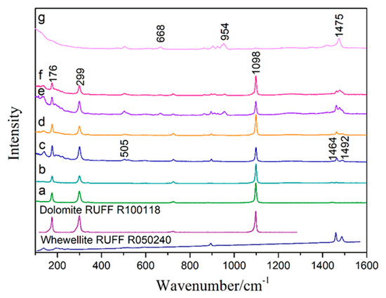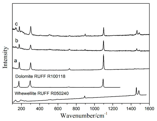 Raman spectra were used to examine the chemical composition of the samples, as shown in Figure 11. The predominant component of specimens is dolomite, and the peaks ascribed to whewellite can be found in b and c specimens. Corrosion products, such as Ca(NO3)2 and CaSO4·H2O, were difficult to detect, and may have been removed from the sample surface by acid rain. The Raman spectra are consistent with the SEM analysis.