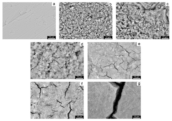 SEM image of untreated and treated samples: (a) UT, (b) AO, (c) 0.02 mol/L CA, (d) 0.04 mol/L CA, (e) 0.06 mol/L CA, (f) 0.08 mol/L CA, (g) 0.10 mol/L CA.