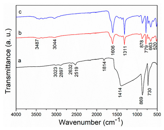 FT-IR spectra of the untreated stone and treated sample were performed to investigate the influence of the two-step deposition process in the functional group of the CaC2O4·H2O film (Figure 5). A contribution from the dolomite was observed at 730cm−1, 869 cm−1 and 1814 cm−1 in the untreated sample (Figure 5a), and another contribution from CaCO3 was detected at 1414 cm−1. Carboxylate groups at 520 cm−1, 663 cm−1, 779 cm−1, 1311 cm−1 and1606 cm−1, and broad vibration bands of −OH groups at 3044 cm−1 and 3487 cm−1, confirm the formation of CaC2O4·H2O phases after the surface treatment (Figure 5b) [44,45,46,47,48,49]. These bands were relatively strong after the two-step deposition process (Figure 5c), which is consistent with the film’s thick structure. In addition, the oxalate group in CaC2O4·H2O was retained before and after treatment with Solution B. In a relatively low concentration (0.02 mol/L), the solution almost has no effect on the mineralogical composition of the AO film.
