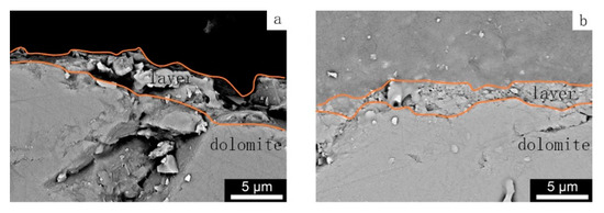 Surface roughness is closely related to the layer structure. To assess the alteration, a direct SEM examination of cross-sectioned samples of treated dolomite was carried out (Figure 7). Roughly, the thickness of the CA layer (3 μm) was similar to the AO layer under the proposed experimental conditions. Furthermore, no obvious warping between the CA layer and the dolomite substrate indicates good compatibility and combination. Consequently, Solution B reduces the AO layer’s porosity.