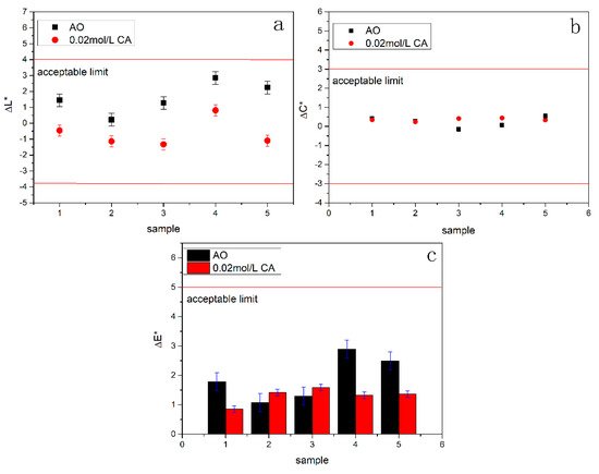 Chromatic change in sample: (a) ΔL * value, (b) ΔC * value, (c) ΔE * value.