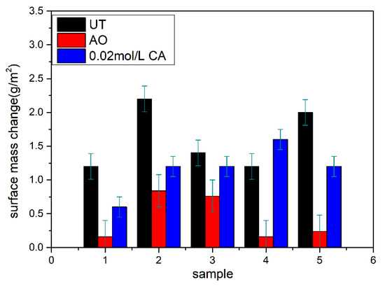 The simulated acid rain (HNO3:H2SO4 = 1:1) resistance results indicate that the two-step deposition of the CaC2O4·H2O film is effective against acid dissolution due to the increased substrate coverage (Figure 10). Surface etching was detected in the untreated sample, and the same phenomenon also appeared in the AO sample after the acid attack. This indicated that the acid rain did not destroy the protective layer, but it had a significant impact on the dolomite. Meanwhile, the dissolution of the treated and untreated specimens was evaluated by measuring the pH value of the runoff solution. Due to the dolomite reacting with the sulfuric acid to form calcium sulfide in the UT sample, the solution pH value changed noticeably (increased to 4.9). The immersion tests appeared to have less impact on the sample AO, with lower variations in the solution pH value (increased to 4.5). The change in the pH value was negligible in the 0.02 mol/L CA sample (increased to 4.3). Therefore, the protective efficiency increased after Solution B was applied to the AO sample surface.