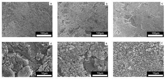 One of the main purposes of the two-step deposition strategy is to improve the film coverage area on the substrate. To see the actual effect, we investigated the microscopic morphology of the treated sample by SEM (Figure 4). On all treated dolomite surfaces, a layer of the newly developed phase was observed. Comparing Figure 4b,c, the effect on the crystal structure of the film can be seen. An irregular CaC2O4·H2O crystal was formed by the treatment of 0.02 mol/L of Solution B (pH = 7), indicating that CaC2O4·H2O crystals develop randomly under higher pH conditions. According to Ruiz-Agudo, the CaC2O4·H2O crystal habit in this condition is predominantly equant, and the precipitation usually forms irregular aggregates [42]. Furthermore, it was discovered that the two-step deposition considerably improves the surface coverage of dolomite by the CaC2O4·H2O coating. The sample treated with Solution B at a relatively high concentration was more prone to cracking than the other samples, which may be subjected to drying stress [43]. Thus, a relatively low concentration of Solution B was used to treat the sample to create an uncracked film and improve surface coverage.