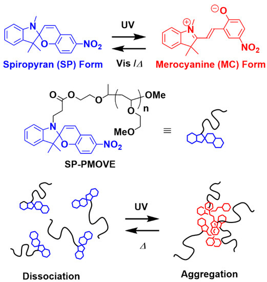 12. Jiang, F.; Chen, S.; Cao, Z.; Wang, G. A photo, temperature, and pH responsive spiropyran-functionalized polymer: Synthesis, self-assembly and controlled release. Polymer 2016, 83, 85–91. [Google Scholar] [CrossRef]