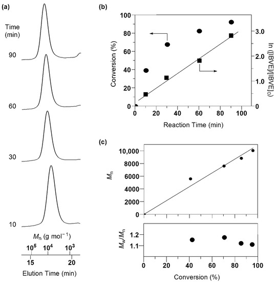 Figure 3. (a) SEC curves of SP-PIBVE measured in THF, (b) a time-conversion curve and first-order kinetic plot for the polymerization of IBVE, and (c) Mn and Mw/Mn values of SP- PIBVE plotted against monomer conversion. Polymerization was conducted with SPVE-TFA/EtAlCl2/dioxane in toluene at 0 °C ([IBVE]0 = 1000 mmol L−1, [EtAlCl2]0 = 20 mmol L−1, [dioxane]0 = 900 mmol L−1, [SPVE-TFA]0 = 10 mmol L−1).