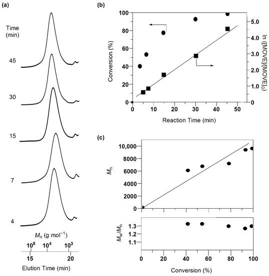 Figure 4. (a) SEC curves of SP-PMOVE measured in THF, (b) a time-conversion curve and first-order kinetic plot for the polymerization of MOVE, and (c) Mn and Mw/Mn values of SP-PMOVE plotted against monomer conversion. Polymerization was conducted with SPVE-TFA/EtAlCl2/dioxane in toluene at 0 °C ([MOVE]0 = 1000 mmol L−1, [EtAlCl2]0 = 20 mmol L−1, [dioxane]0 = 900 mmol L−1, [SPVE-TFA]0 = 10 mmol L−1).