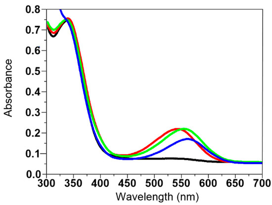 Figure 5. Absorption spectra of solutions of SP-PMOVE (0.1 mM) without UV irradiation (black line) and SP-PMOVE (0.1 mM) in iPrOH (blue line), EtOH (green line) and MeOH (red line) at 25 °C upon UV irradiation for 2 min.