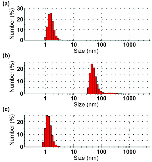 When we experiment with UV light irradiation to EtOH solution of SP-PMOVE (2 wt%), we found that the polymer solution showed strong Tyndall scattering observable with the naked eye by using a green laser pointer. Therefore, it means that the self-assembled aggregates grew by UV irradiation. We further evaluated the size of the self-assembled aggregates of SP-PMOVE upon UV irradiation formed in EtOH by dynamic light scattering (DLS) analysis at 25 °C. DLS measurement of an EtOH solution of SP-PMOVE prior to UV irradiation showed the presence of nearly uniform-sized nanoparticles with an average diameter of ca. 1.6 nm (Figure 6a). The EtOH solution after exposure to UV irradiation showed significant differences, showing polymer aggregates with an average size of approximately 50 nm in the DLS profile (Figure 6b). After that, after standing it in the dark for 20 min at room temperature, the polymer solution changed from magenta to colorless, and as a result of DLS measurement again, the size of the nanoparticles recovers to the original size of ca. 1.6 nm (Figure 6c). These results suggest that photoisomerization of the terminal SP moiety of SP-PMOVE induced aggregation and dissociation of SP-PMOVE and that the aggregations were able to control by photoirradiation.