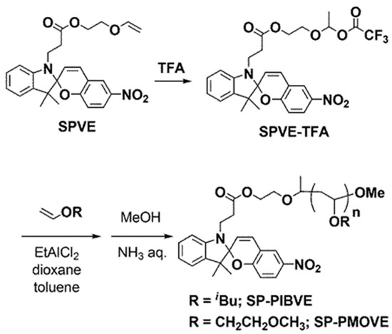 The development and research of stimulus-responsive polymers are gaining increasing attention as smart materials need to be developed for a variety of applications such as catalysts [1,2] and drug delivery [3,4,5,6]. In particular, the response by photostimulation is a very powerful tool among various stimulations [6,7]. This is because there is no need to add chemical reagents externally, and in addition, local irradiation of the sample is possible. For this reason, many photoresponsive compounds have been used in stimulus-responsive materials. For example, azobenzene [8,9] is the most widely used compound for cis-trans isomerization, and compounds with unique photoreactivity such as spiropyran [10,11,12] for heterolytic cleavage and diarylethene [13,14] for electrocyclic reactions are also used. It is noteworthy that the photo heterolytic cleavage of spiropyran (SP), unlike many other photoresponsive compounds, dramatically changes not only the molecular structure of the compound but also the polarity of the molecule. Therefore, polymers containing SP species are very attractive as effective stimulus-responsive materials for drug delivery and controlled release systems due to the dramatic change in solubility with photoirradiation [15,16,17]. However, almost the reported studies using photoresponsive SP moieties have been classified into pendant-functionalized SP-carrying polymers, and a few have possessed an SP moiety at the end of a polymer chain. The SP end-capped polymers so far reported have been synthesized via living radical polymerization, and the synthesis of such polymers by living ionic polymerization has not yet been reported. This is because the nitrobenzene group in SP moiety deteriorates the livingness of cationic polymerization [18]. We attempted the living cationic polymerization of a VE having a pendant SP moiety (SPVE) but failed to achieve controlled polymerization. We, therefore, expected the potential ability of the SPVE derivative (SPVE-TFA) as an initiator for living cationic polymerization of vinyl ethers (VEs) because the concentration of the nitro groups in the polymerization system is sufficiently suppressed to make it possible to synthesize well-defined SP end-capped polyVEs through a living polymerization process. SPVE-TFA can be readily prepared by the addition of TFA to SPVE. Thus, we studied the synthesis of a series of SP end-capped polyVEs by living cationic polymerization with SPVE-TFA as an initiator. An advantage of the synthetic strategy developed in this study is that one can design a wide variety of SP end-capped polymers by living cationic polymerization of functionalized VEs. We have succeeded in synthesizing poly(vinyl ether)s (polyVEs) having a π-conjugated functional group at the end of the polymer chain by using an initiator having a π-conjugated molecule [19,20,21,22,23,24]. Furthermore, as a result of investigating the self-assembling behavior of amphipathic polyVE having C60 at the terminal, we found that it self-assembles to form polymeric micelle-like aggregates due to intermolecular hydrophobic interactions between the C60 moieties of polyVE. In addition, the external addition of γ-CD induced the dissociation of the polymer aggregates into molecularly dispersed free polymers [20]. This means that the self-assembly behavior of polymers can be controlled by a slight change in the solubility of the terminal group. This unexpected observation prompted us to synthesize a new amphiphilic polyVE having an SP moiety at the polymer terminus (Figure 1). First, we investigate the living cationic polymerization behavior of isobutyl vinyl ether (IBVE) as a VE monomer with a new SP-appended initiator (SPVE-TFA) (Scheme 1). Subsequently, an amphipathic vinyl ether monomer (2-methoxyethyl vinyl ether; MOVE) was used in the same polymerization system for the synthesis of a target amphiphilic polyVE having an SP moiety at the polymer terminus (SP-PMOVE). Furthermore, the self-assembly behavior of SP-PMOVE and the photoresponsive properties were investigated in detail. We expect that such polymers induce macroscopic changes in the state due to changes in the chemical structure of the terminal molecules, allowing the on/off switching of aggregate formation by using photoirradiation.