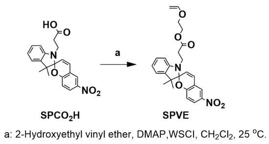To solution of SPCO2H [25] (890 mg, 2.0 mmol), DMAP (50 mg, 0.42 mmol) and 2-hydroxyethyl vinyl ether (0.20 mL, 2.4 mmol) in CH2Cl2 (50 mL) was added WSCI (0.5 g, 2.4 mmol) at 25 °C and the mixture was stirred for 15 h at 25 °C under N2. The reaction mixture was washed with water, dried over Na2SO4 and evaporated to dryness. The residue was subjected to column chromatography (ethyl acetate/hexane = 1/1, v/v) on SiO2 to allow isolation of SPVE as a yellowish oil (830 mg, 1.8 mmol) in 92% yield.