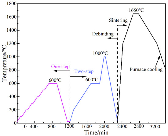 The particle size and additives [22,23,24] have an impact on the properties of final ceramics, which are mainly focused on ceramics prepared by traditional technology and PPM technology. Huai et al. [25] studied the effects of nanosized and micron-sized additives (TiO2) on Al2O3 ceramics. The 0.15 wt % TiO2 is conducive to the sintering properties of Al2O3 ceramics under 1300–1500 °C, and nanosized TiO2 is more conducive to the bulk density, hardness and wear properties at the same sintering temperature. Wu et al. [26] investigated the effects of particle size and the degreasing process on the densification of Al2O3 ceramics. The results show that the samples containing both nanosized and micron-sized particles have the highest compactness. The combination of powder with bimodal particle-size distribution and the vacuum-degreasing process can effectively realize the three-dimensional printing of ceramic products. Zhang et al. [27] studied the effects of fine particles and sintering additives on the properties of Al2O3 ceramics prepared by SLA by adding fine particles and sintering additives (TiO2 and MgO) to ceramics. The best ceramics contain 42.5 wt % coarse particles, 7.5 wt % fine particles, 1 wt % MgO and 3 wt % TiO2. The results showed that fine particles can improve the activity of Al2O3 ceramics and reduce the sintering temperature. Sintering additives TiO2 and MgO can improve the solid-state sintering properties of Al2O3 ceramics. The final properties of ceramics are determined by the appropriate proportion of particle size and additives.