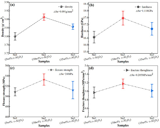 The effects of n-Al2O3 on the properties of Al2O3 composite ceramics: (a) density, (b) hardness, (c) flexure strength, (d) fracture toughness.
