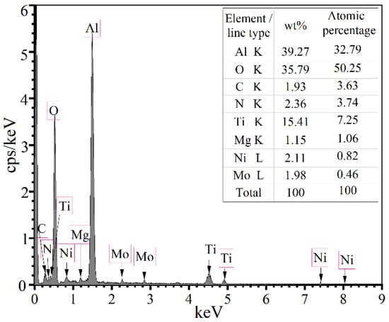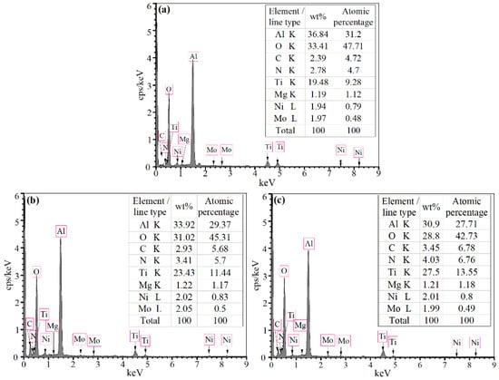 Figure 6 shows the obvious peaks corresponding to the Al and O elements, followed by elements Ti, N and C, etc., which indicated the content of Al and O elements in St-x type ceramics is higher. The data table in the EDS spectrum shows that except for Al, O, Ti, N and C elements from Al2O3 and μ-TiCN, the content of other elements fluctuates (Mg, Ni and Mo) slightly near the constant value (Figure 6a–c), and the fluctuation value is within 2% of the error range of the EDS spectrum test, which is almost close to the proportion designed in St-x type composite ceramic components.
