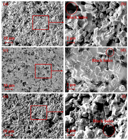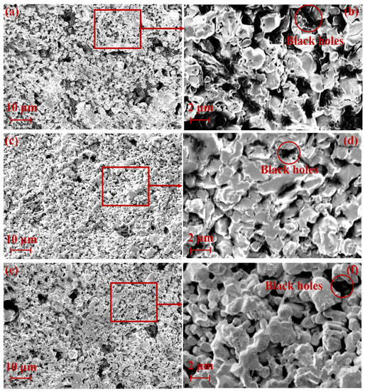 For St-x type composite ceramics, St1 (Figure 7a,b) has the highest porosity of 8.909%, followed by St3 (Figure 7e,f) with a porosity of 7.184%, and St2 (Figure 7c,d) has a lower porosity of 4.073%. At high magnification, it can also be observed that the significance and randomness of St3 ceramic pores are higher than St1 and St2. In comparison, St2 has a more uniform and dense microstructure (Figure 7c,d), which is consistent with the best volume density of St2 in Figure 5a. In addition, St1 with the lowest volume density (3.92 g/cm3) in St-x type ceramics is also higher than Sn2 with the best volume density (3.891 g/cm3) in Sn-x type ceramics.