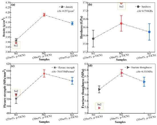 The effects of μ-TiCN on the mechanical properties of St-x type ceramics: (a) density, (b) hardness, (c) flexure strength, (d) fracture toughness.