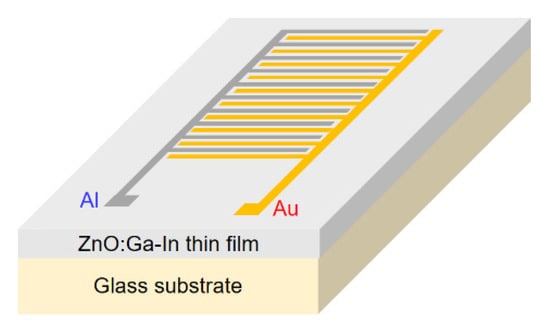 The sol-gel and spin-coating process is a typical chemical solution deposition process for the preparation of large-area functional oxide films. It has several attractive features, including low-cost equipment, a simple process, easy adjustment of the chemical composition, flexible integration with microelectronics processes, and high efficiency in technological production [,]. The influence of asymmetric metal contacts on the photoresponse of GaN MSM-PDs has been reported. However, the improvement of the photosensing characteristics of solution-processed ZnO-based MSM-PDs by an asymmetric contact structure has not been studied. In this study, the authors prepared ZnO:Ga-In transparent semiconductor thin films, which exhibited the qualities of optoelectronic devices, for application as the sensing layer of MSM-PDs. The photodetection properties of ZnO:Ga-In MSM-PDs with Al-Al symmetric electrodes and Al–Au asymmetric electrodes were compared. In addition, the work function difference between the Al and Au metals allowed us to fabricate an Al/ZnO:Ga-In/Au UV photodetector with an asymmetric metal contact structure, which could lead to UV light detection without an externally applied voltage to achieve a self-powered MSM-PD.