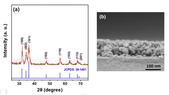 (a) X-ray diffraction (XRD) pattern of ZnO:Ga-In thin film deposited on glass substrate by sol-gel spin-coating and (b) cross-sectional FE-SEM micrograph of the corresponding sol-gel-derived ZnO:Ga-In thin-film sample.