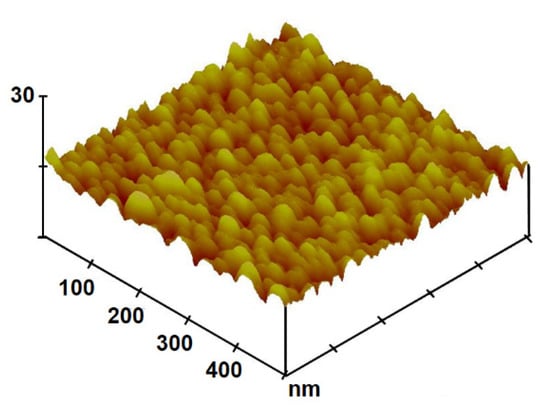 The surface morphology and root-mean-square (RMS) roughness of the obtained ZnO:Ga-In thin film was investigated by SPM. A three-dimensional (3D) SPM image acquired from the free surface of a glass/oxide thin film sample is presented in Figure 3. The image shows a granular structure without microcracks or tiny pores; the surface consisted of close-packed nano-sized particles. The average particle size, estimated from the corresponding 3D SPM image, was 39.3 nm, and the surface RMS roughness of the ZnO-based thin film samples was 3.3 nm.