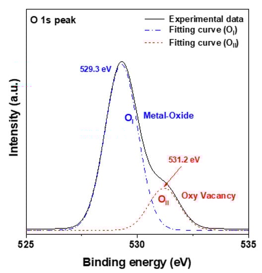 The presence of the expected elements (Ga, In, Zn, and O) in the obtained ZnO-based thin film was confirmed by a broad scan XPS analysis (data not shown). The narrow scan XPS examination identified the chemical bonding states of O in the thin film sample. Figure 4 shows the core level XPS spectrum of O 1s, which exhibited a broad, significantly asymmetric feature in the high binding energy region (solid line). The curve of the experimental data (high-resolution O 1s XPS spectrum) was deconvoluted by a Gaussian curve fitting into two distinct sub-curves (dashed lines), which denoted the areas of two components, with OI and OII for the corresponding two oxygen levels []. The component on the low binding energy (OI) side had strong intensity. It was centered at about 529.3 eV and attributed to O2− ions bonded with metal ions (Zn2+, Ga3+, or In3+), such as O-Zn bonds, in the hexagon wurtzite ZnO lattice. The component of the high binding energy (OII) side was centered at 531.2 eV. It was related to the O2− ions close to the oxygen-deficient regions and associated with the concentration of oxygen vacancies. Thus, a change in this component area would correspond to an alteration in the oxygen-vacancy concentration. The OII/Ototal area ratio for the ZnO:Ga-In thin film was 19.30%. The result revealed that the Ga-In co-doped ZnO thin films had a higher OII/Ototal area ratio than that of the undoped ZnO thin film in a previous report (17.74%.) [], indicating that weaker oxygen–metal bonds formed in the impurity co-doped ZnO-based thin film. This led to the high-level oxygen vacancy concentration in the as-prepared ZnO:Ga-In thin film.