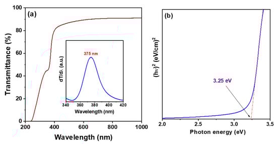 The optical transmittance spectrum of the glass/thin film sample was measured to investigate the optical properties, and the results, presented in Figure 5a, revealed significant absorption in the UV region and high transparency in the visible spectrum region. Due to the direct and wide bandgap of greater than 3.2 eV, the ZnO:Ga-In thin film sample exhibited good average visible light transmittance of 88.4% in the wavelength range of 400–800 nm. The first derivative of the optical transmittance (T) with optical wavelength (λ) was calculated to estimate the absorption edge position of the oxide thin film sample. The plot of dT/dλ versus wavelength is provided in the inset of Figure 5a; the position of the maximum peak corresponded to the optical band-edge absorption of the ZnO-based thin film. As shown in that plot, the peak position for ZnO:Ga-In thin film was 375 nm, which is close to that of the 2 at% Al-doped ZnO semiconductor thin film (372 nm) [].