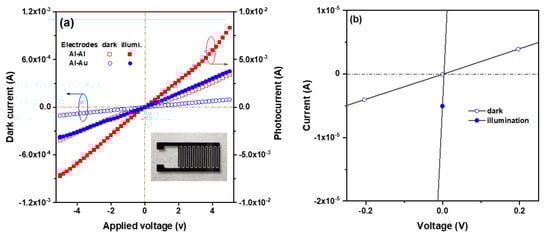 Figure 6a shows the current–voltage (I-V) characteristics of the two kinds of MSM-PDs (with symmetric or asymmetrical electrodes) in the dark condition and under UV light illumination. A voltage sweep from −5 V to +5 V was applied across the two interdigitated electrodes. The digital photograph of the as-fabricated ZnO:Ga-In MSM PD with asymmetrical Al–Au interdigital electrodes is shown in the inset of Figure 6a. Both the dark current and the photocurrent rose in direct proportion to the increases in applied voltage because the internal electrical field between the interdigital electrodes was proportional to the external voltage applied to the contact pads. It is noted that the asymmetric electrodes device exhibited a lower dark current level than that of the symmetric electrodes device; the resistances of the corresponding devices, determined by Ohm’s law (R = V/I), were 4.99 × 104 Ω (Al–Au device) and 1.29 × 104 Ω (Al–Al device) in the dark condition. In addition, the illumination-to-dark current ratios for the symmetrical electrodes and asymmetrical electrodes devices were 20.3 and 39.0, respectively. The I-V characteristics demonstrated that the application of a pair of asymmetric metal electrodes to ZnO-based semiconductor thin film can effectively lower the dark current and significantly improve the photosensing property. Moreover, Figure 6b shows that the asymmetric electrodes device exhibited a low level of photocurrent under UVA illumination at zero bias voltage (solid circle).