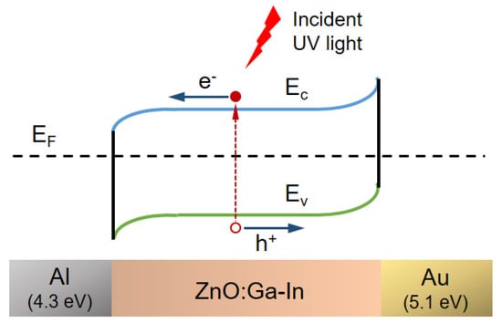 Schematic energy band diagram of the n-type ZnO:Ga-In semiconductor layer and Al–Au asymmetric electrodes without applied bias and under UV illumination.