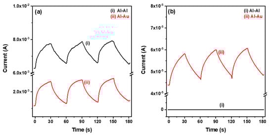 Time-resolved photocurrent curves measured under multiple on/off illumination cycles for photodetectors with symmetrical or asymmetrical interdigital contacts at bias voltage of (a) 5 V and (b) 0 V. The interval of UVA light illumination was maintained at 30 s.