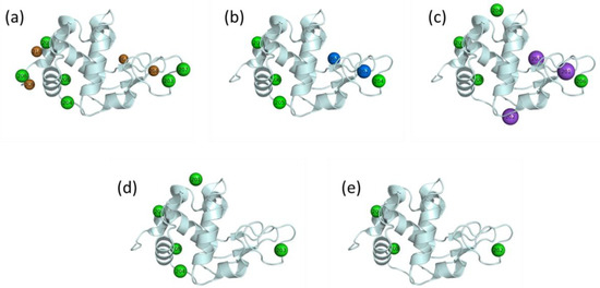 The location of metal (red sphere) and chloride (green sphere) ions associated with the lysozyme molecule in Cu-(a), Ni-(b), Na-(c), K-(d), and Li-crystals (e).