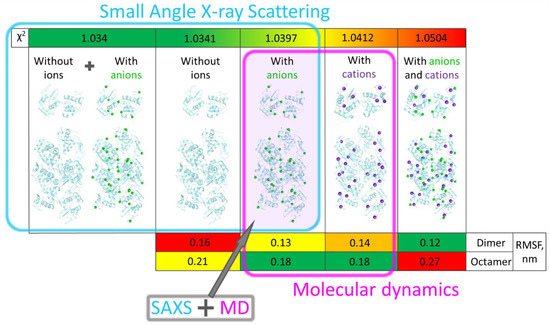 In [9], it was shown that it is chlorine ions which stabilize dimer and octamers in crystallization solution. Combining both SAXS and MD results (Figure 2), one can see that the best agreement with experimental SAXS and MD data is reached for oligomers with a minimum number of incorporated chlorine ions.