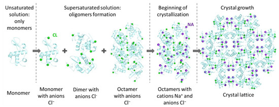 As the SAXS data are more sensitive to the atoms with higher electron density (in our case, cations) and the molecular dynamics is also sensitive to the role of anions which are “light” for X-rays, the combination of these two methods gave the opportunity to define the initial steps before protein crystal growth as the following (Figure 3): firstly, only chloride ions (all found in crystal structure or some of them) associated with monomers and oligomers with these embedded ions are formed, and, finally, cations incorporate in the oligomers, which leads to the formation of crystal, including all precipitant ions bound with it.