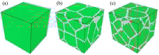 The atomic-scale SC model is shown in Figure 1a. The SC was oriented with its <100>, <010>, and <001> aligned respectively with the x-, y-, and z-axes. The average lattice parameter of the CoCrNi alloy is 3.559 Å, and the cohesive energy obtained at this point is -4.32 eV/atom. In order to study the effect of crystal orientation on mechanical properties, another model with different crystal orientations was established. This sample was oriented with its <001>, <10>, and <110> aligned with the x-, y-, and z-axes. For the polycrystalline model, eight randomly oriented grains were created using the Voronoi construction method [13]. The obtained polycrystalline structure is shown in Figure 1b. For polycrystals with nanotwins, single crystals with certain twin boundary spacing (λ = 1.85, 2.47, 3.08, 3.70, and 4.32 nm) were constructed first, and then polycrystals with nanotwins were constructed through the Voronoi construction method, as shown in Figure 1c. The sizes of MEA samples were 106.77 × 106.77 × 106.77 Å in X, Y, and Z directions (~108,000 atoms). Three types of atoms were equimolarly randomly distributed. Periodic boundary conditions were employed in all three directions. The timestep was always 1fs in the simulation. The conjugate gradient algorithm was used to minimize the energy of all samples. The energy tolerance and force tolerance were 10−12 and 10−12, respectively. Various temperatures (77, 300, 500, and 800 K) were calculated. For every temperature, the samples were relaxed by the Nose–Hoover isobaric-isothermal (NPT) ensemble for 100 ps. After the balancing process, the samples were deformed at a strain rate of 1 × 108 to 1 × 1010 s−1 along the Z direction.