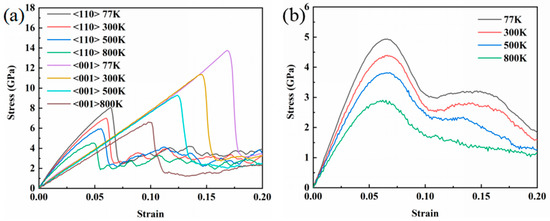 (a) Tensile stress-strain curves in <001> and <110> directions at different temperatures, (b) compressive stress-strain curves in <001> direction at different temperatures.