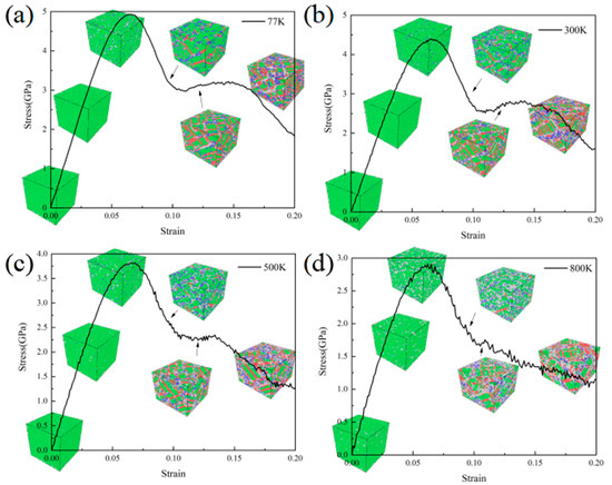 In order to investigate the effect of temperature on the mechanical properties of polycrystals with nanotwins, tensile tests at 77, 300, 500, and 800 K were conducted. The stress-strain curves of samples at different temperatures are shown in Figure 12a–d. As the temperature increases, the tensile strength decreases. Similar to the previous trend exhibited at 300 K, the trend of the maximum stress of the samples at other temperatures increases and then decreases with decreasing λ, reaching a maximum at λ = 3.08 nm (Figure 12e). To further understand the effect of temperature on the mechanical properties of polycrystals with nanotwins, the deformation mechanism and dislocation movement of the alloy at different temperatures were studied. The structure and dislocations at different temperatures are shown in Figure 13. At high temperatures, the GBs slip is obvious. The proportion of disordered atoms at the GB increases, and the dislocation density is small. At low temperatures, dislocations move more slowly, which may lead to dislocation entanglement, resulting in higher dislocation density. The high dislocation density delays the stress drop and enhances the mechanical properties of the alloy. With the decrease of temperature, the deformation mechanism dominated by the GBs slip changes to that dominated by dislocation slip.