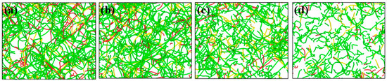Dislocation distribution at 77 K (a), 300 K (b), 500 K (c), and 800 K (d) under the same strain rate.