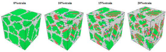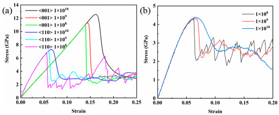 The mechanical properties of CoCrNi MEA at different strain rates of 1 × 108, 1 × 109, and 1 × 1010 s−1 are shown in Figure 5 and Table 2. As the strain rate increases, the elastic modulus is constant, while the maximum stress increases significantly. As shown in Figure 5a, the maximum tensile stress along the <110> direction is lower than that in the <001> direction because the higher density of atomic arrangement in the <110> direction makes slip deformation easier. To further analyze the mechanical and structural responses at different strain rates during the compression process, the stress and structural evolution at strain rates of 1 × 108, 1 × 109, and 1 × 1010 s−1 were tracked. Until the strain reaches ~5%, the atoms maintain the FCC structure and the stress increases linearly with the increase of strain. After the strain reaches ~5%, some of the atoms deviate from their equilibrium positions and rearrange themselves into BCC structure with lower coordination number, leading to a decrease in the slope of the nonlinear elastic region. At the beginning of plastic deformation at strain rates of 1 × 108 s−1, the HCP structure rapidly generates and expands, resulting in a sharp decrease in stress, as shown in Figure 6a. However, after the plastic deformation begins at strain rates of 1 × 1010 s−1, many small stacking faults (SFs) are formed, which intersect each other and eventually form a dense three-dimensional network of SFs, as shown in Figure 6b. The network hinders the further growth of small dislocation loop and thus, the stress drop is delayed.