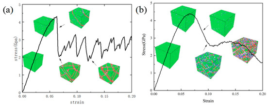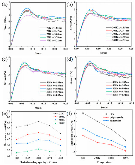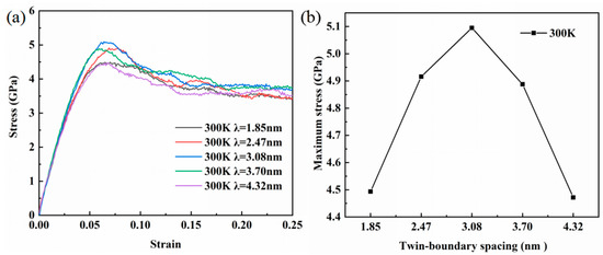 In this study, the effect of TB spacing on the mechanical properties was investigated using polycrystals with nanotwins as the research object. Figure 10a shows the stress-strain curves of samples with different TB spacing at 300 K. The stress of all stress-strain curves decreased after reaching maximum stress, which was commonly found in MD simulations and attributed to the nucleation of dislocations [20,21]. As shown in Figure 10b, with the increase of λ, the maximum stress increases firstly and then decreases after λ = 3.08 nm.