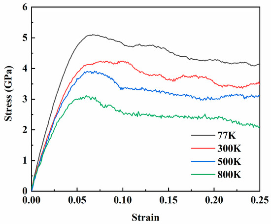 The stress-strain curves of CoCrNi MEA under tension and compression at different temperatures are shown in Figure 2. With increasing the temperature from 77 to 800 K, the tensile strength along the <110> direction decreases from 13.75 to 6.60 GPa (Table 1). Different from the linear elastic deformation region that occurs in the <001> direction, the stress of the samples grows nonlinearly throughout the elastic deformation region when tensioned in the <110> direction, as shown in Figure 2a. In addition, the tensile strength of the samples along the <110> direction decreases significantly. This is presumably due to the anisotropy of materials, where the <110> direction has a higher density of atomic arrangement and is more prone to slip deformation. In this study, compression of CoCrNi at different temperatures was also calculated. Similar to the tensile strength, the compressive strength decreases with increasing temperatures, as shown in Table 1 and Figure 2b.