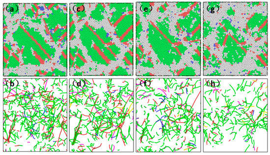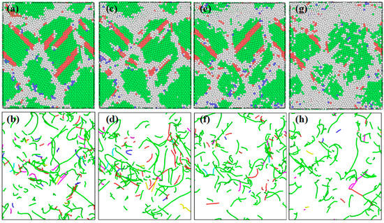In order to study the effect of temperature on the mechanical properties and deformation behavior, the stress and structural evolution during compression at different temperatures were investigated. As shown in Figure 3, FCC atoms dominate during the elastic deformation. The body-centered cubic (BCC) atoms emerge with the strain increased, leading to a decrease in the slope of the nonlinear elastic region. After reaching the maximum value, the stress starts to drop, at which time the hexagonal close-packed (HCP) atoms rapidly generate and expand from the BCC atomic aggregation. The massive formation and accumulation of dislocations, mainly Shockley dislocations (the green line in Figure 4 represents the Shockley dislocation) slow down the stress drop. Compared with the short dislocations generated at high temperatures, the long and twisted dislocations generated at low temperatures have a greater inhibitory effect on the stress drop, which results in a faster stress drop at high temperatures than at low temperatures, as shown in Figure 4.