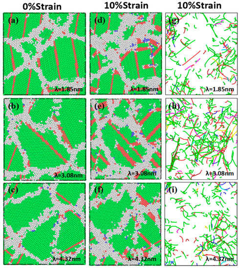 Initial structures at 300 K with TB spacing of (a) 1.85 nm, (b) 3.08 nm, and (c) 4.32 nm, structure of the samples at the strain of 10% with TB spacing of (d) 1.85 nm, (e) 3.08 nm, and (f) 4.32 nm, and dislocations of the samples at the strain of 10% with TB spacing of (g) 1.85 nm, (h) 3.08 nm, and (i) 4.32 nm.