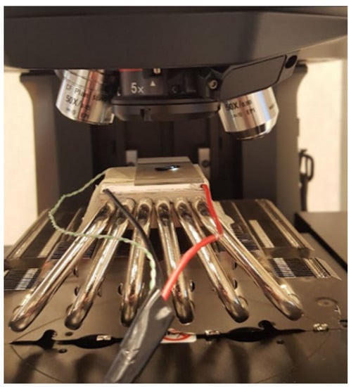 A Keyence VK-X1000 CLSM (Itasca, IL, USA), mounted with a VK-D1 motorised XY-stage was utilised for the recording of differential interference contrast (DIC) CLSM images with a laser and white light source on the surface of the bituminous samples. A DIC CLSM image has the advantage of introducing moderated contrast to optical images, producing a pseudo-3D effect. The Nikon Lens Plan Apo EPI with 150 times magnification, 5 nm lateral resolution and 10 nm axial resolution was chosen for this study. An in-house thermal fixture was also assembled (Figure 1), consisting of electrical variable resistors that were fixed accordingly to obtain the required temperature on top of a metallic plate. The temperature of this small heating element was adjusted based on calibrated thermocouples inserted in the bituminous sample on the glass plate. Investigations on the waxy bitumen’s microstructure were conducted in cooling and heating cycles, in a range of temperatures between 10 to 80 °C at a cooling/heating cycle of 1.25 °C/min and a lower cooling/heating cycle using 0.5 °C/min rate. Preliminary investigations showed featureless surfaces for temperatures above 65 °C in both cycles as well as for the wax-free bitumen B which was not investigated further. Additionally, the effect of annealing at room temperature was also investigated for the waxy bitumen after 24 h in a heating scan.