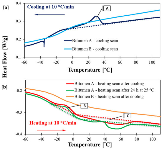 DSC scans obtained during cooling/heating for both binders and heating after 24 h annealing temperature at 25 °C for bitumen A, are shown in Figure 2. The cooling scan of bitumen A shows an exothermic transition with a maximum at around +30 °C, which is attributed to the wax crystallisation. This transition is indicated by the area A in Figure 2a. It continues down to the glass transition which appears for bitumen A at around −30 °C. The cooling scan of the wax-free bitumen B confirms the absence of crystallisable components as no exothermic transition can be observed, whereas the glass transition temperature for this bitumen can be found around −15 °C.