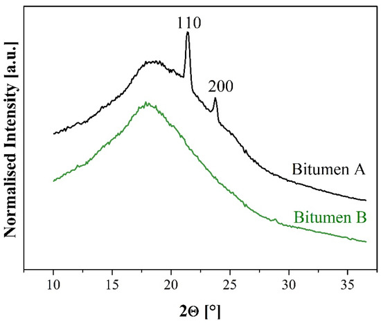 Initially, a WAXD investigation for both bituminous binders was performed at room temperature. As can be seen in Figure 3, in contrast to bitumen B, only bitumen A contains two sharp crystalline reflections in the WAXD patterns, which are due to orthorhombically organised paraffins as described by Bunn and of which the labelled 110 and 200 reflections are most prominent [37]. This is in line with the absence of crystallinity expected from the wax-free crude and initially confirmed with DSC.