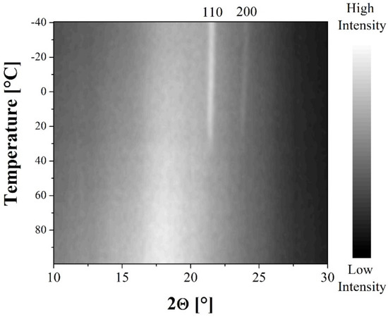 In a second experiment, WAXD patterns for bitumen A, which showed crystalline reflections at room temperature, were recorded during cooling and heating. A representation of the temperature-dependent WAXD patterns during the cooling scan is shown in Figure 4, in which the scattered intensities are presented by means of a grey scale. It appears that the orthorhombic 110 and 200 reflections are present between roughly +35 and −40 °C and increase upon cooling.