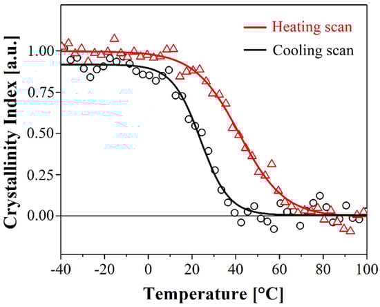 From the integral of the 110 and 200 reflections, a crystallinity index can be obtained as described in Section 3.2.2. The index was arbitrarily normalised to its value at −40 °C during the heating run. In Figure 5 this crystallinity index is plotted during the cooling (black data) and heating (red data) scans. For better visualisation of the crystallinity evolution within bitumen A, a smooth sigmoidal fitting curve was added. At low temperatures, both the cooling and heating scans show a plateau of the crystallinity up to 10 and 30 °C, respectively, followed by a steep decrease in intermediate temperatures. At high temperatures, the wax within bitumen A is fully molten and the crystallinity equals zero. The end melting temperature is around 70 °C for the heating scan which is in agreement with the DSC reported temperature. Similar to DSC, undercooling effects are observed by WAXD and the onset of crystallinity at around 50 °C corresponds very well to the DSC temperatures. The starting value of the crystallinity in the heating run also seems to be slightly higher than the end value of the cooling run, indicating that additional crystallinity was generated during the short isothermal stay at −40 °C.