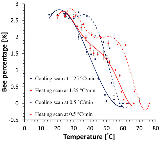 With CLSM, the percentage of the bee structures (% of the total area) for bitumen A is given in Figure 6, within the temperature range between +10 and +80 °C, during cooling and heating at two different rates. Only the microstructure evolution of bitumen A was investigated, as the non-waxy bitumen B showed no microstructural characteristics in accordance with other studies [38].
